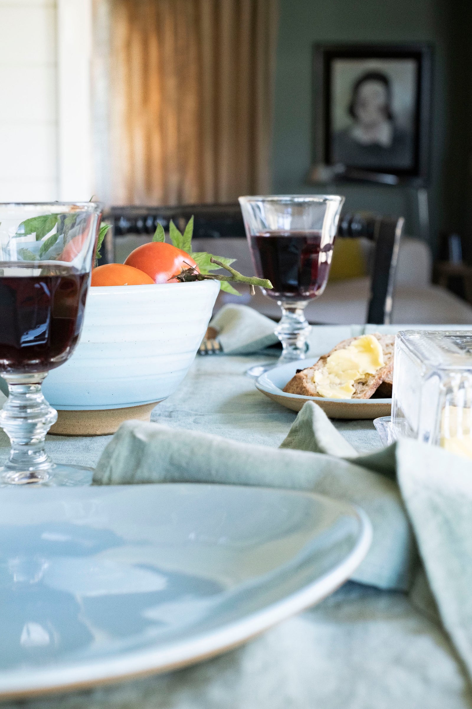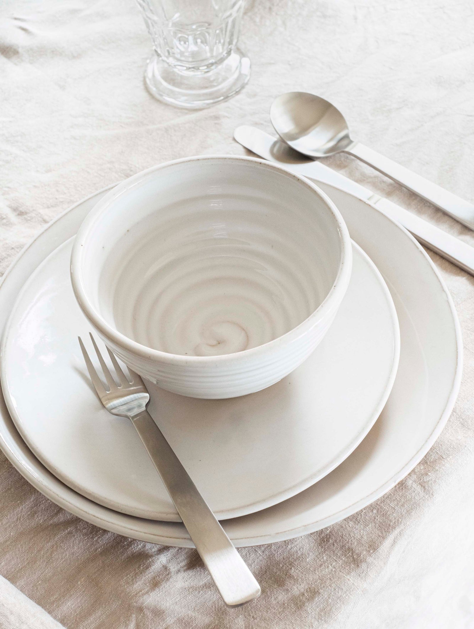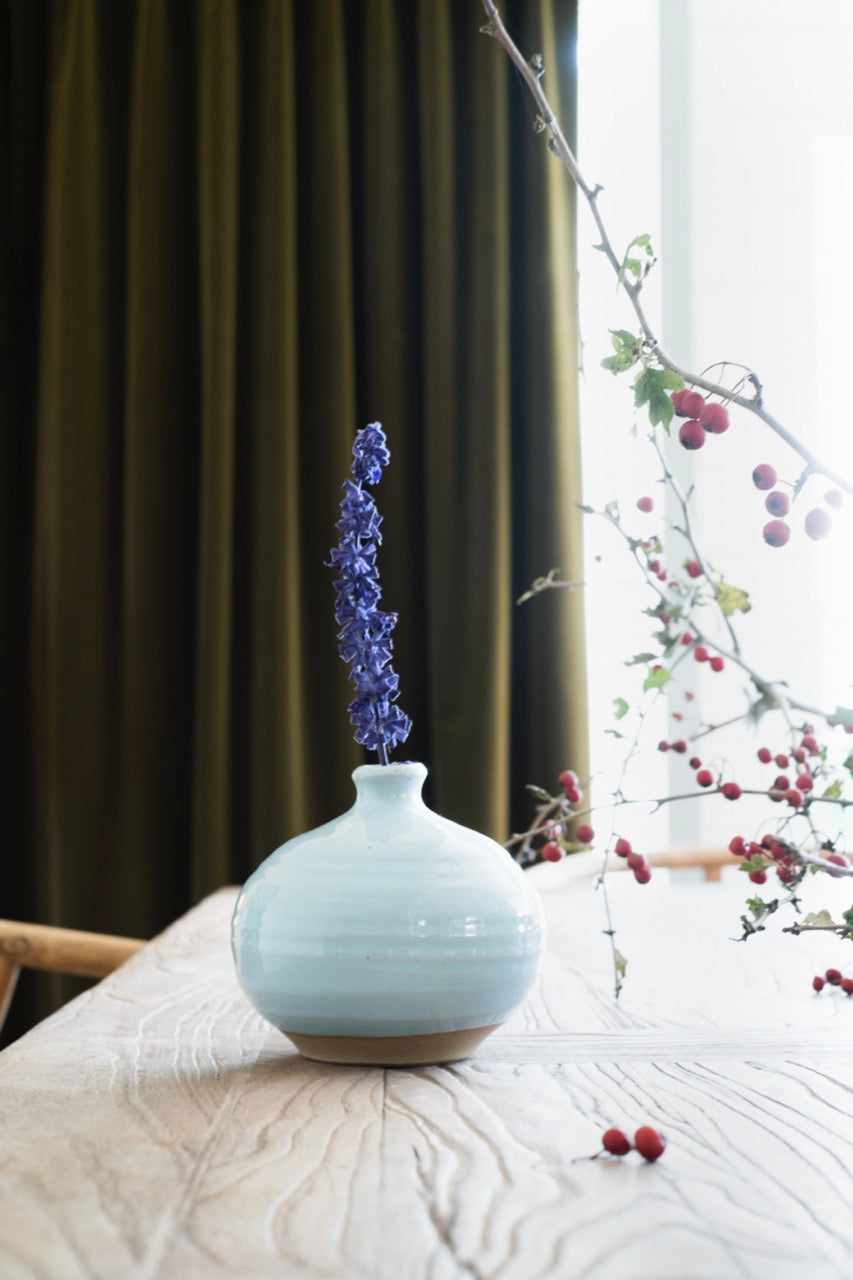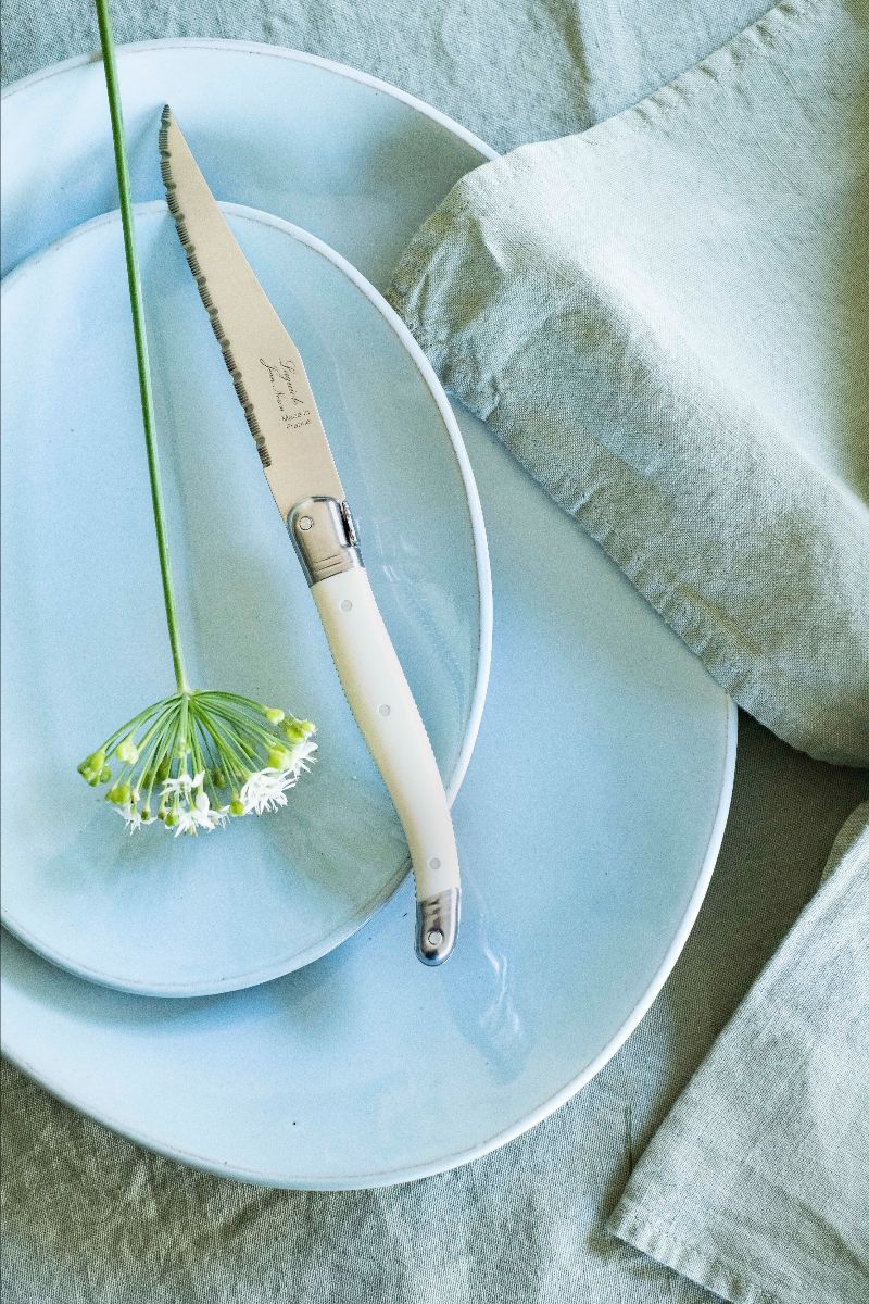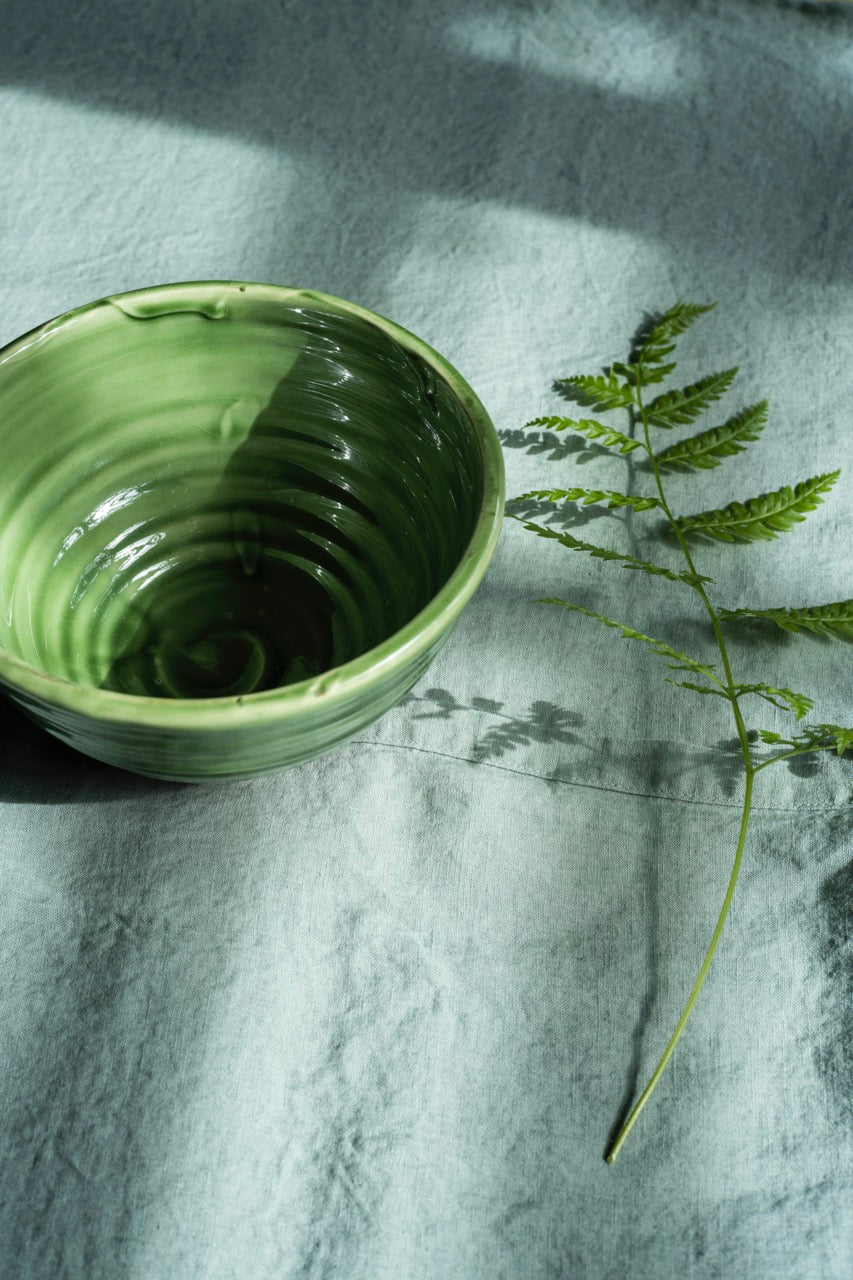 There’s something about the way the natural environment nurtures you here. It’s very grounding and the pots I make have been influenced by that: very simple and straightforward. The colours come from the landscape and the sea … blues and greens and chalky whites … and one of our most popular colours is Aqua. It instantly cheers up any breakfast table and we’ve found it sits especially happily with our pressed glass and our celadon-coloured French linen.
